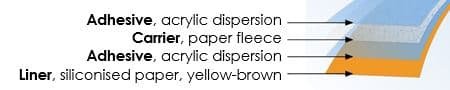doppelseitiges Klebeband auf Basis einer Acrylatdispersion, aufgebracht auf ein Papiervlies.